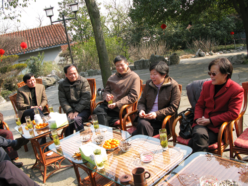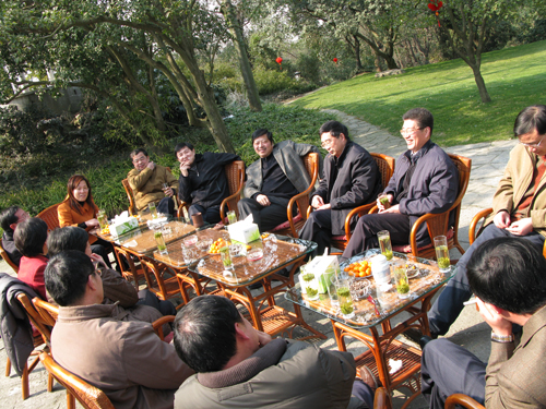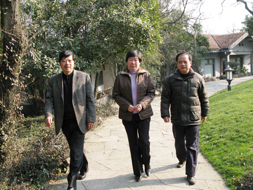 2008年2月19日,江苏省纺织工业协会会长谢明(中)、副会长韩平(右)在江苏天圣达集团董事长吴惠明(左)的陪同下,参观了无锡名人书画艺术博物馆。